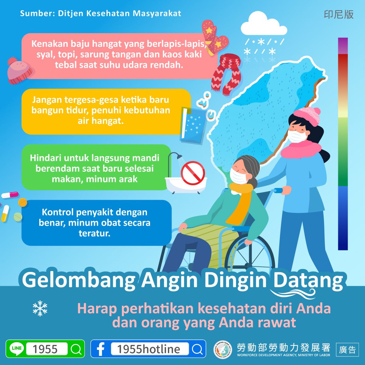 Indosuara - Dalam beberapa waktu terakhir, ramai perbincangan di media Taiwan tentang datangnya gelombang dingin ke Taiwan yang akan menyebabkan suhu udara turun drastis. Mengingat bahayanya hal ini, Layanan Aduan 1955 mengeluarkan kembali panduan menghadapi cuaca dingin bagi pekerja migran asing yang ada di Taiwan.